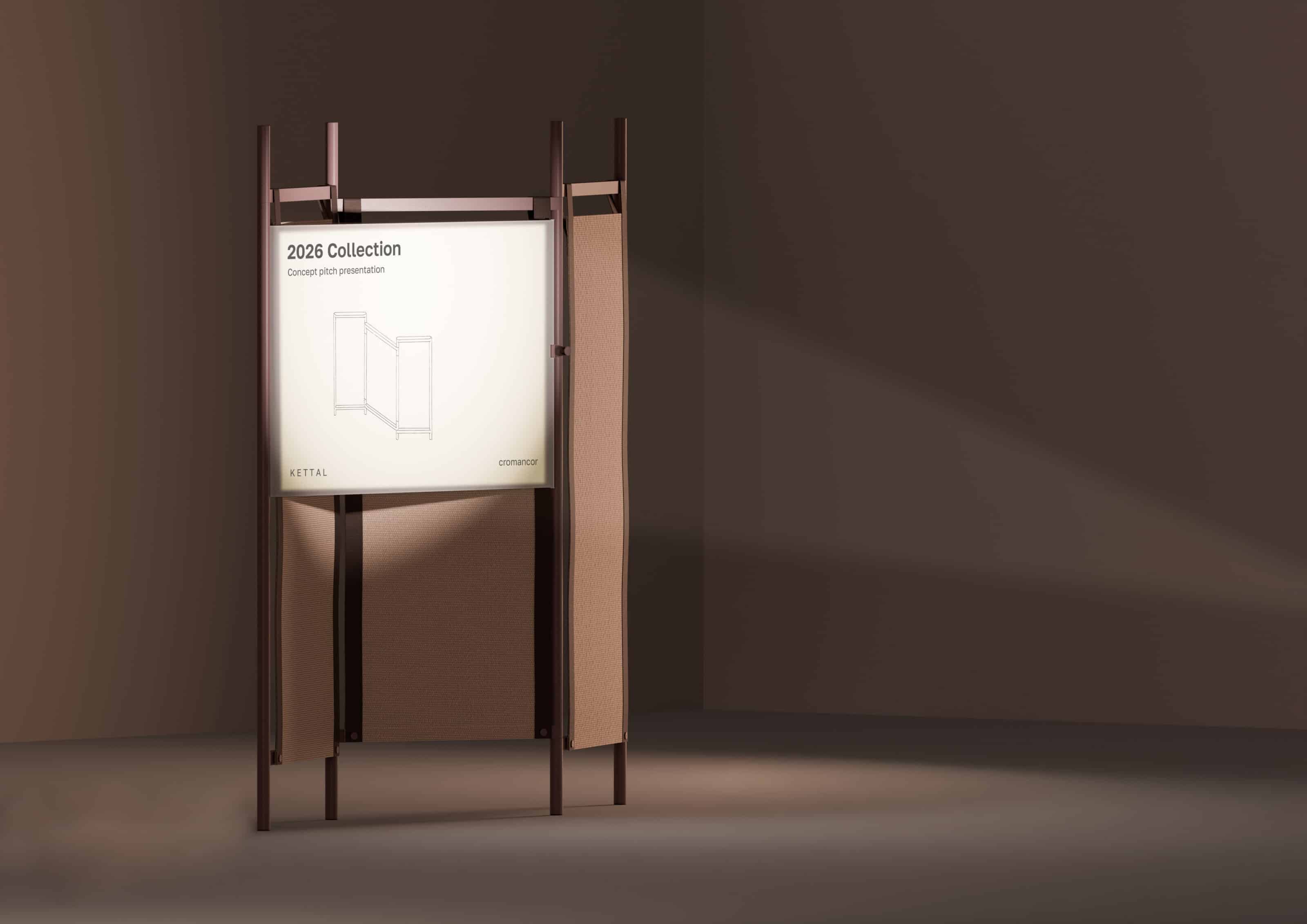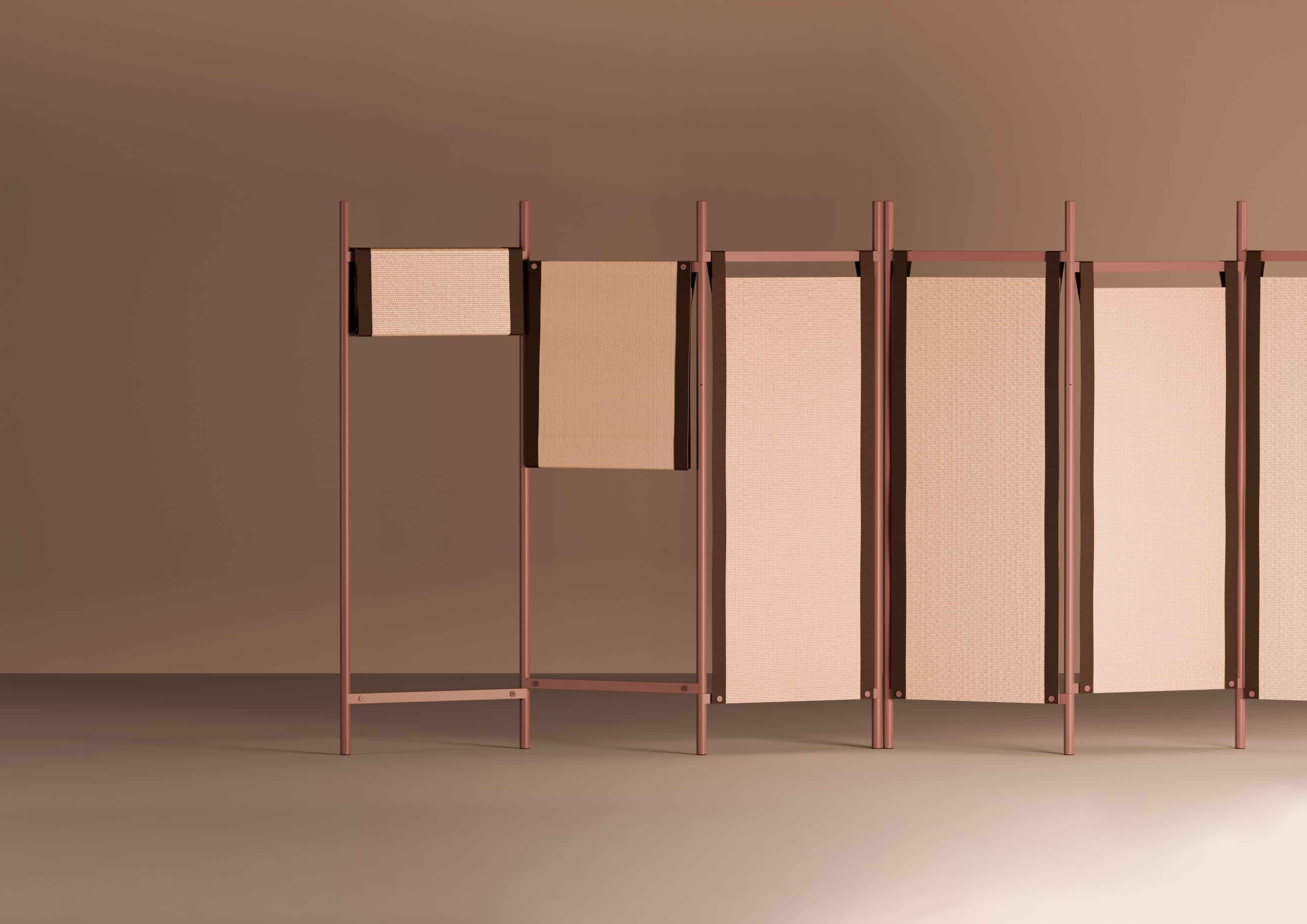 A folding screen, or "biombo", that brings domestic comfort into the office, an ephemeral wall that creates intimacy without full isolation. Building on this furniture typology, new modes of interaction and personalization were developed. The result is a system of foldable fabric panels that soften boundaries, allowing spaces to be divided or connected as needed. To enhance adaptability, a projection screen for audiovisual content was added, also reducing blue light exposure from conventional screens.
